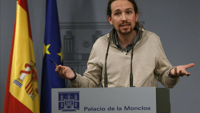la rueda de prensa que el líder de Podemos pronunció en el Palacio de La